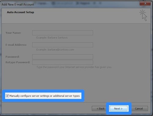 | 1. Tick the 'Manually configure server settings or additional server types' checkbox 2. Press the 'Next >' button |