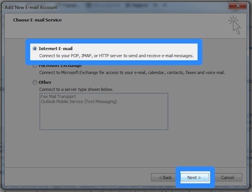 | 1. Choose the 'Internet E-mail' option 2. Press the 'Next >' button |