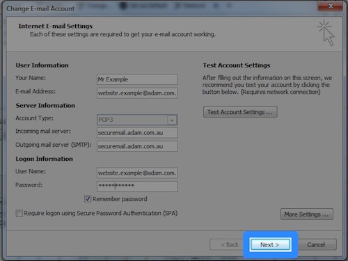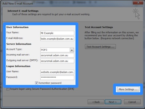 | 1. Enter your name e.g. 'John Smith' into the 'Your Name:' field 2. Enter your email address e.g. 'name@company.com.au' into the 'Email Address:' field 3. Select 'POP3' in the 'Account Type:' dropdown 4. Enter 'securemail.adam.com.au' into the 'Incoming mail server:' field 5. Enter 'securemail.adam.com.au' into the 'Outgoing mail server (SMTP):' field 6. Enter your email address e.g. 'name@company.com.au' into the 'User Name:' field 7. Enter your Adam Internet password into the 'Password:' field 8. Check the 'Remember password' checkbox Press the 'More Settings ...' button |