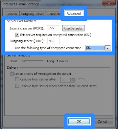 | 1. Select the 'Advanced' tab 2. Set the 'Incoming server (POP3):' port number to '995' 3. Check the 'This server requires an encrypted connection (SSL)' checkbox 4. Set the 'Outgoing server (SMTP):' port number to '465' 5. Select 'SSL' from the 'Use the following type of encrypted connection:' dropdown under 'Outgoing server (SMTP)' Press the 'OK' button |