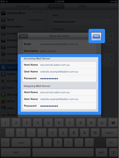 | Enter 'Incoming Mail Server' settings: 1. Host Name is 'securemail.adam.com.au' 2. User name is your email address (i.e. website.example@adam.com.au) 3. Password is your password Enter 'Outgoing Mail Server' settings: 1. Host Name is 'securemail.adam.com.au' 2. User name is your email address (i.e. website.example@adam.com.au) 3. Password is your password Press 'Save' It may take a few minutes before the next slide appears |