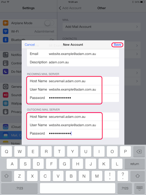 | Enter 'Incoming Mail Server' settings: 1. Host Name is 'securemail.adam.com.au' 2. User name is your email address (i.e. website.example@adam.com.au) 3. Password is your password Enter 'Outgoing Mail Server' settings: 1. Host Name is 'securemail.adam.com.au' 2. User name is your email address (i.e. website.example@adam.com.au) 3. Password is your password Press 'Save' It may take a few minutes before the next slide appears |