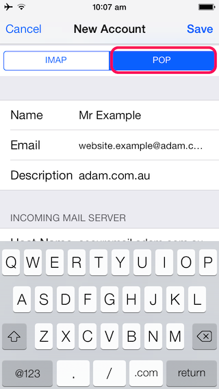 Enter 'Incoming Mail Server' settings: 1. Host Name is 'securemail.adam.com.au' 2. User name is your email address (i.e. website.example@adam.com.au) 3. Password is your password |