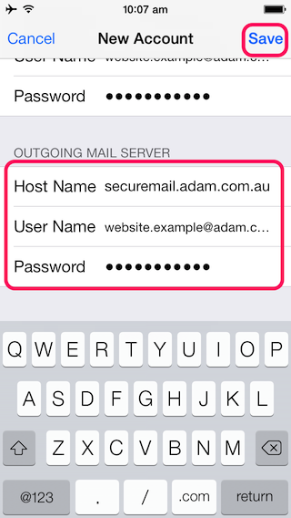 | Scroll down and enter 'Outgoing Mail Server' settings. 1. Host Name is 'securemail.adam.com.au' 2. User name is your email address (i.e. website.example@adam.com.au) 3. Password is your password 4. Press 'Save' |